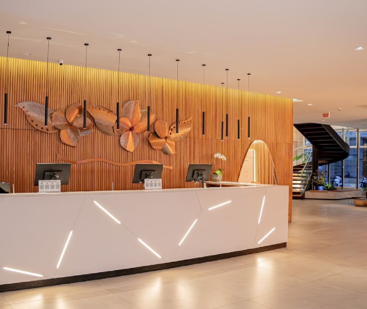 Logo na chegada, o hóspede é recebido por uma atmosfera que une modernidade e requinte. A recepção foi completamente remodelada e apresenta design contemporâneo, painéis em madeira, iluminação cênica e elementos arquitetônicos que valorizam o ambiente. O novo layout inclui espaços instagramáveis, cuidadosamente pensados para proporcionar uma experiência visual marcante desde os primeiros instantes da hospedagem.