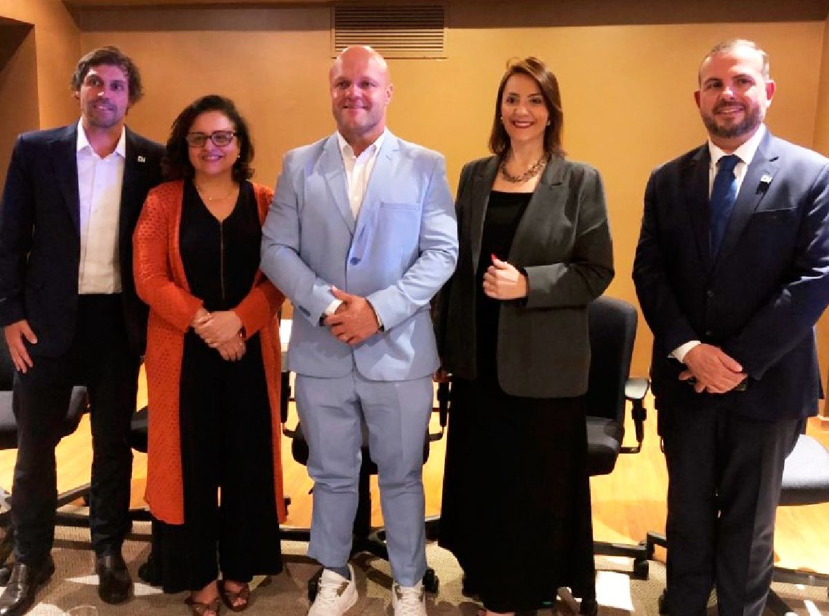 Autoridades presentes e apoiando mais um grande evento de Campos de Jordão na reinauguração do Centro de Convenções Campos Hall: Erich Progin, COO do Campos Hall, Mônica Samia, secretária executiva da Secretaria de Turismo e Viagens do Estado de São Paulo; Carlos Eduardo Pereira da Silva (Caê), prefeito de Campos do Jordão; Luana Nogueira, presidente e diretora executiva da Alagev; e Sidney Isidro, presidente do Comtur de Campos do Jordão. Foto: Divulgação Guia do Turismo Brasil